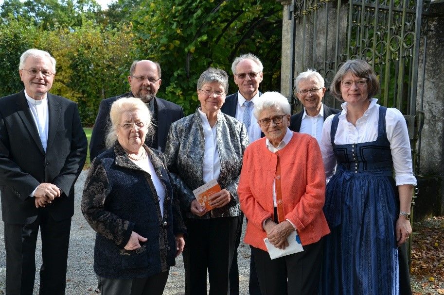 Vor geöffneten Türen stehen in der hinteren Reihe (v.l.n.r.): Prälat Lorenz Kastenhofer, Leiter der Hauptabteilung Liturgie und geistliches Leben im Erzbischöflichen Ordinariat, Weihbischof Wolfgang Bischof, Festredner Professor Hubert Wolf und der geistliche Begleiter der ASE, P. Hans Abart SJ. vorne: Erika Ranner, Leiterin Dagmar Petermann, Traudl Weinzierl und Barbara Gradl von den ASE.