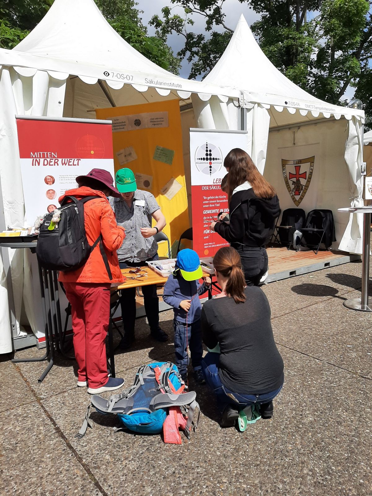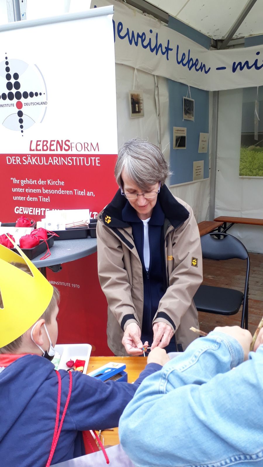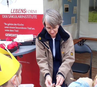 Wir, Mitglieder unterschiedlicher Säkularinstitute, waren präsent, um ein Stück weit unser eher verborgenes Leben den Menschen nahezubringen. Das Basteln von Fadenkreuzen bot die Möglichkeit, besser ins Gespräch zu kommen, das doch recht sperrige Wort „Säkularinstitut“ verständlicher zu machen und etwas von unserer Sendung in der Welt erahnen zu lassen. Kärtchen, auf denen die Gebetsecke einzelner Mitglieder abgebildet waren, konnten in dem Bewusstsein mitgenommen werden, dass es gottgeweihte Menschen gibt, die mitten in der Welt für die Anliegen anderer beten und arbeiten.