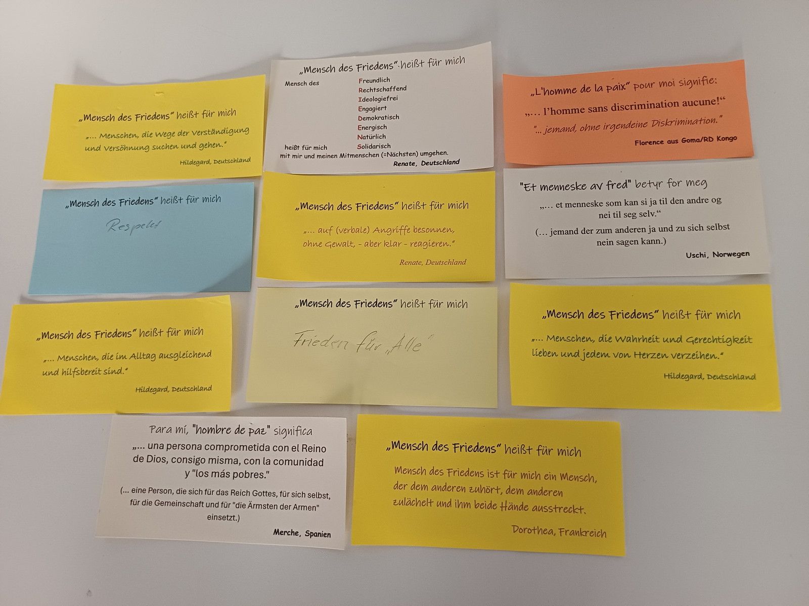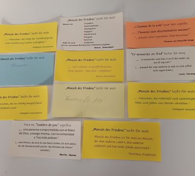 Schon im Vorfeld hatten wir Menschen aus verschiedenen Ländern weltweit gebeten, den Satz „Mensch des Friedens“ heißt für mich: …‘ zu vervollständigen! In den Tagen der Begegnung in Erfurt wurden weitere Zettel ausgefüllt. Drei davon sollen hier exemplarisch genannt werden: