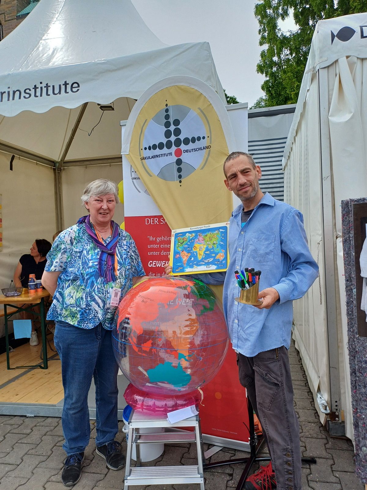 Auch für Kinder gab es spezielle Angebote, wie z. B. Weltkarten puzzeln oder einen großen Globus mit Begriffen und Bildern für den Frieden zu bemalen.